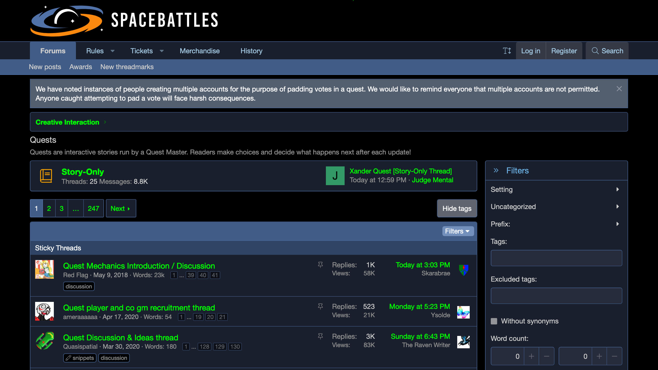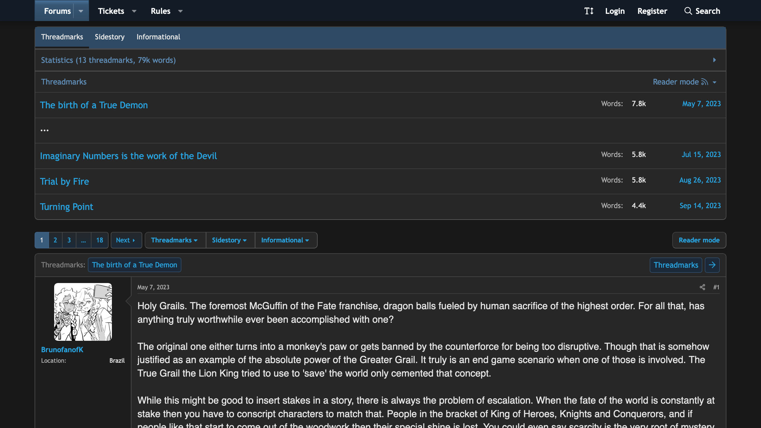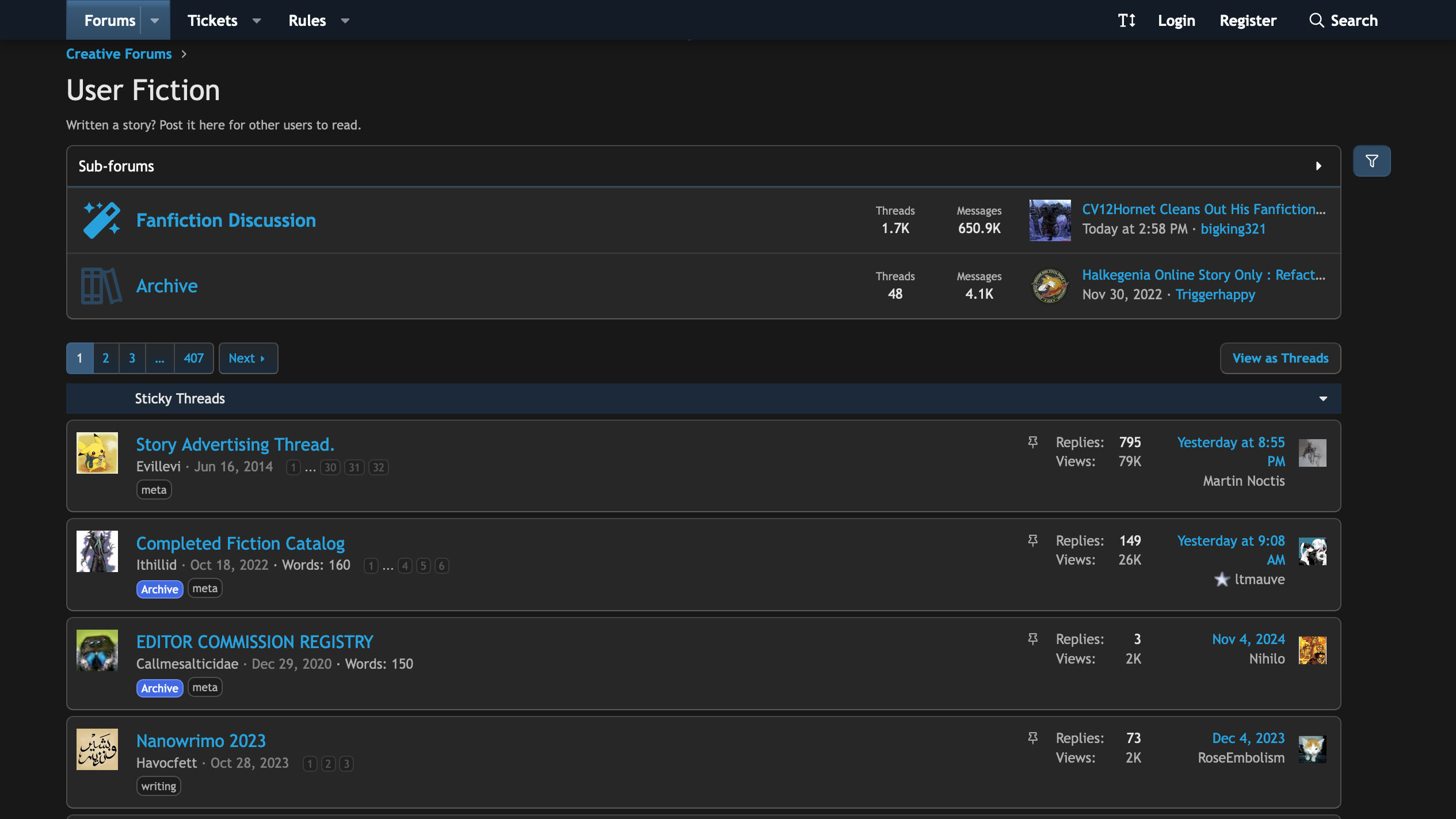 SpaceBattles is a unique choice. It's not truly a dedicated fanfiction hub, but rather a discussion forum. Noneheless, it has a great library of fanfics under the category of creative writing, and due to the nature of the site, it has a noticably higher level of quality compared to the previous sites. Alongside that, it has the best formatting here, with images, gifs, videos, and links able to be embedded in the stories directly. Additionally, due to being a forum site, readers can directly comment on a story's page, allowing ffor direct interaction with not just the writer, but also other readers, as well as vote in polls held by the writer which can impact the story. Furthermore, each chapter can be separated into different categories, from official threadmarks and helpful informationals, to visuals focused media and extra material. On top of that, a uniqe form of fanfiction can be found, called quests. These quests rely on the voting function as well as dice rolls to create unique stories that heavily involve the readers and the choices they make. Finally, like Wattpad, you can also find original works here, though not to the same amount as in Wattpad. Unfortunately, unlike the previous sites, SpaceBattles is stricter on the kind of content allowed on it, with those considered "NSFW" being forbidden and could lead to the writer being banned on the site. What is considered "NSFW" are mainly sexual content and excessive violence. And lastly, many of the functions listed here does require a registered account to be used, though lickily it's not needed to read the stories themselves.