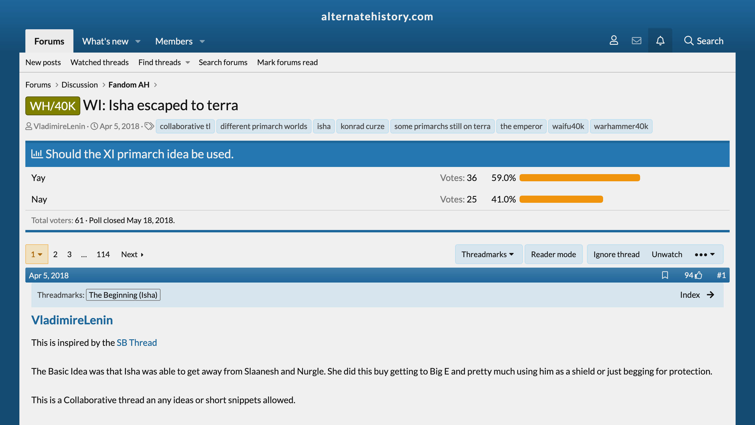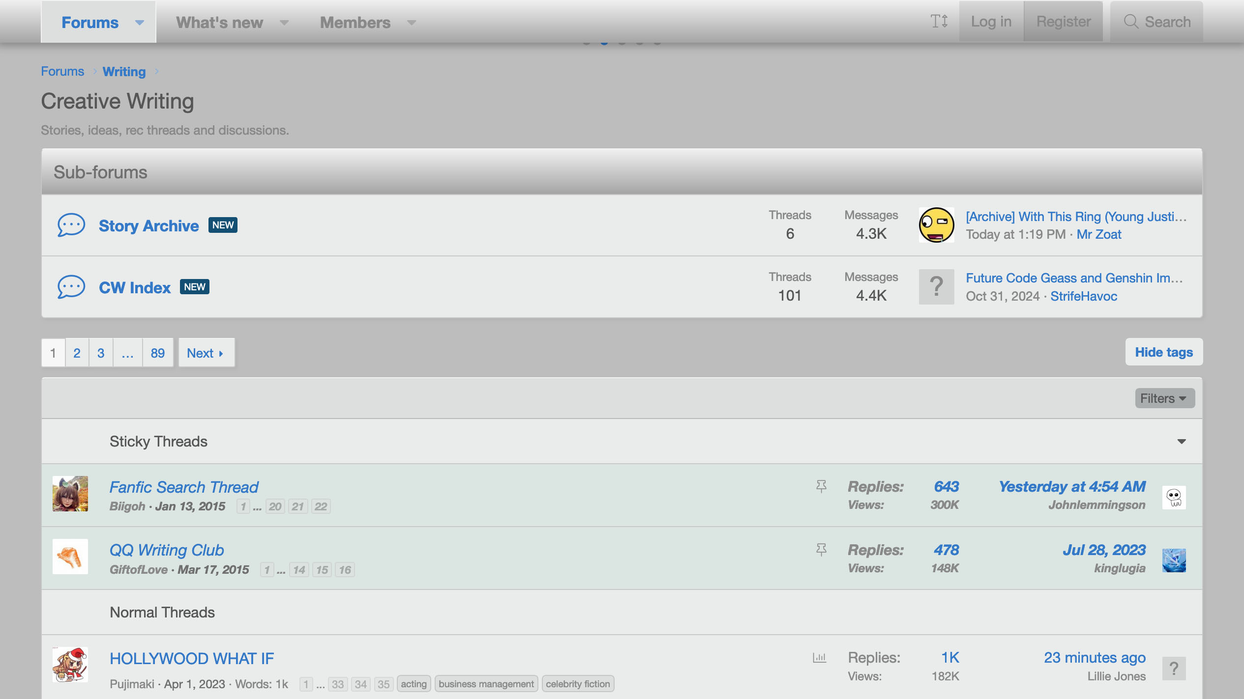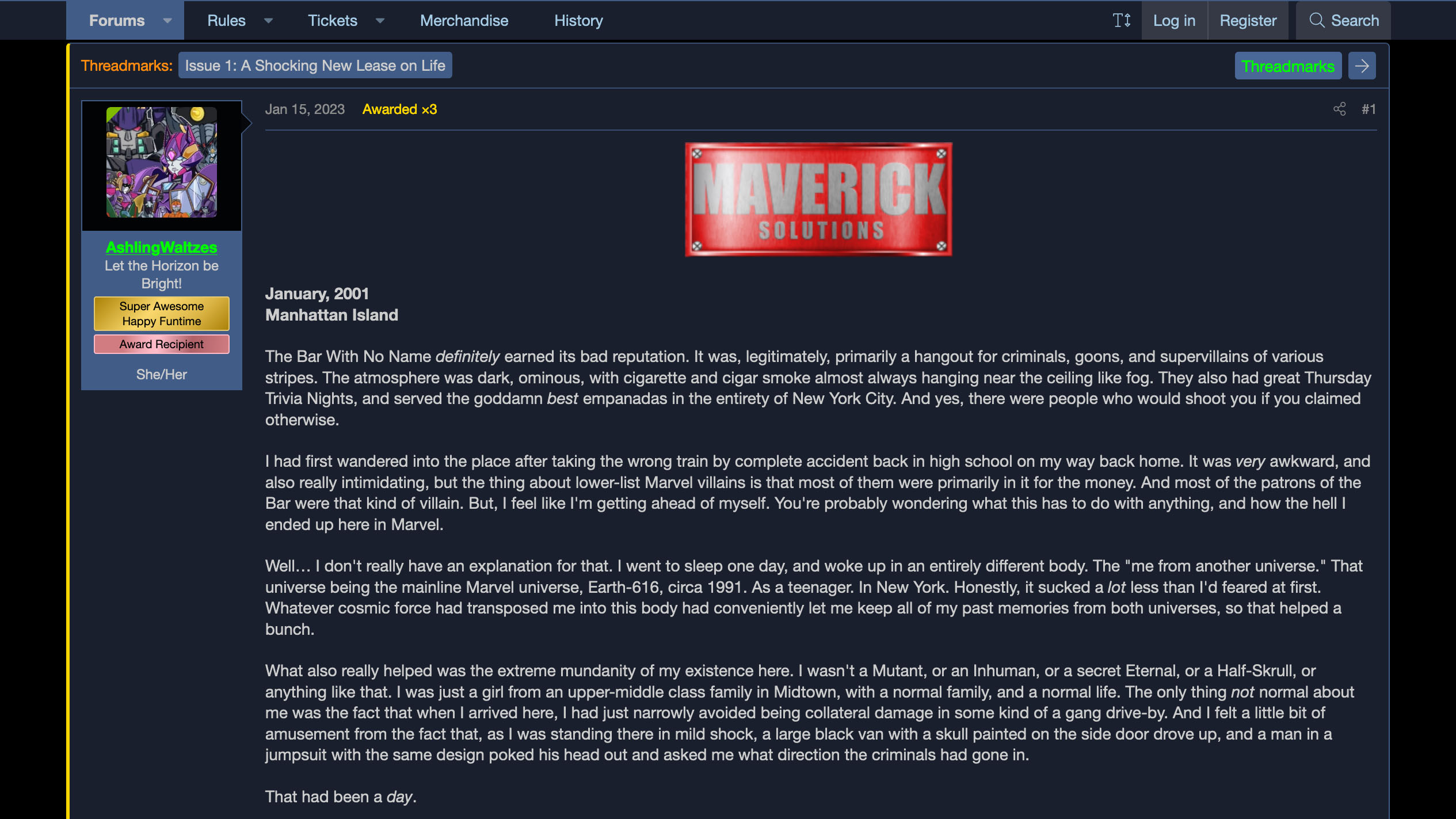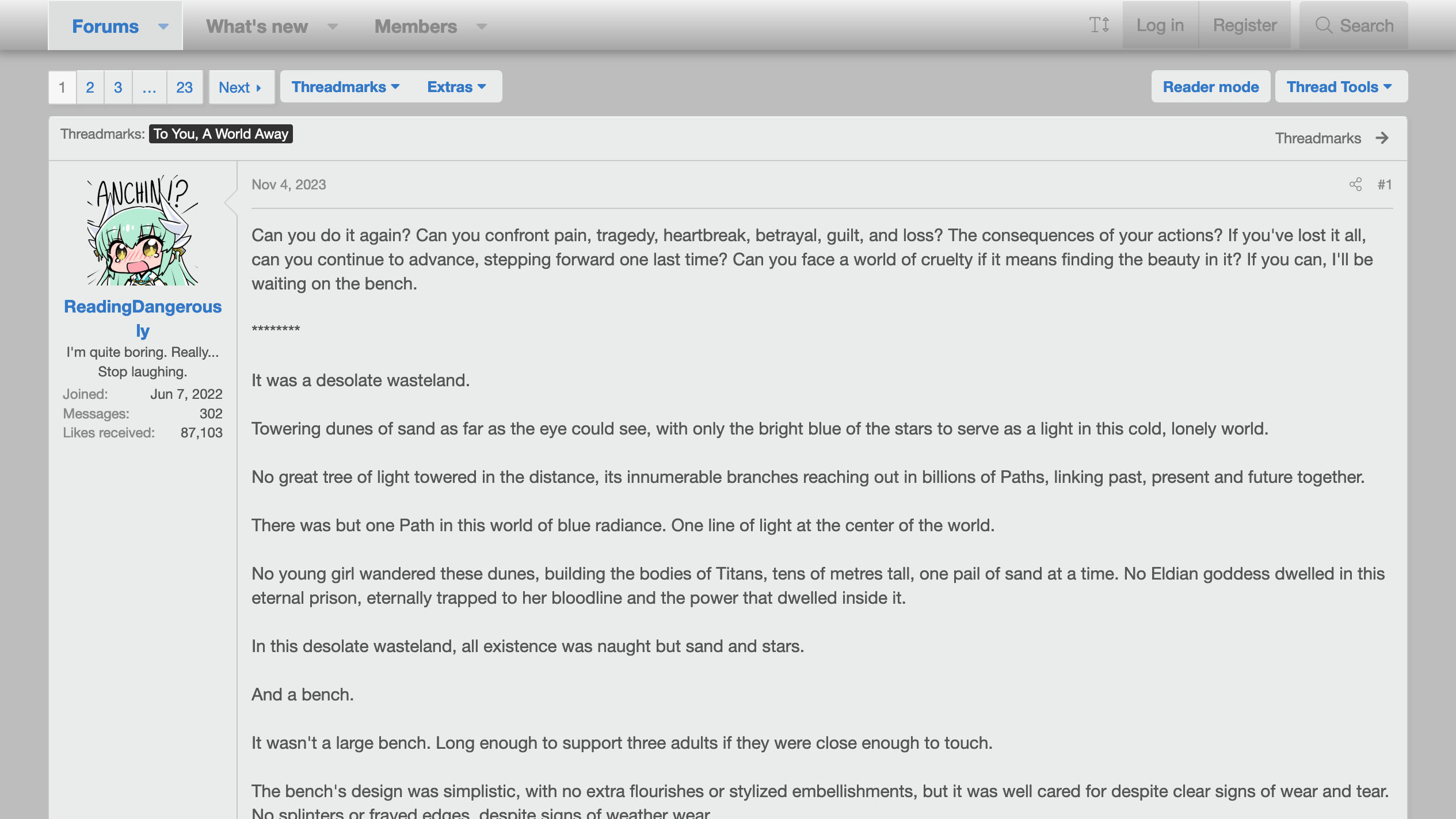 SpaceBattles is a unique choice. It's not truly a dedicated fanfiction hub, but rather a discussion forum. Noneheless, it has a great library of fanfics under the category of creative writing, and due to the nature of the site, it has a noticably higher level of quality compared to the previous sites. Alongside that, it has the best formatting here, with images, gifs, videos, and links able to be embedded in the stories directly. Additionally, due to being a forum site, readers can directly comment on a story's page, allowing ffor direct interaction with not just the writer, but also other readers, as well as vote in polls held by the writer which can impact the story. Furthermore, each chapter can be separated into different categories, from official threadmarks and helpful informationals, to visuals focused media and extra material. On top of that, a uniqe form of fanfiction can be found, called quests. These quests rely on the voting function as well as dice rolls to create unique stories that heavily involve the readers and the choices they make. Finally, like Wattpad, you can also find original works here, though not to the same amount as in Wattpad. Unfortunately, unlike the previous sites, SpaceBattles is stricter on the kind of content allowed on it, with those considered "NSFW" being forbidden and could lead to the writer being banned on the site. What is considered "NSFW" are mainly sexual content and excessive violence. And lastly, many of the functions listed here does require a registered account to be used, though lickily it's not needed to read the stories themselves.